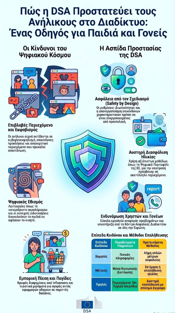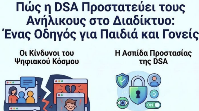 Η Πράξη για τις Ψηφιακές Υπηρεσίες (DSA) είναι ο νέος νόμος της Ευρωπαϊκής Ένωσης που στοχεύει να κάνει το διαδίκτυο ασφαλέστερο για όλους, με ιδιαίτερη έμφαση στα παιδιά και τους εφήβους. Το infographic εξηγεί με απλό τρόπο τι υποχρεώσεις έχουν οι πλατφόρμες και πώς προστατεύονται οι ανήλικοι.